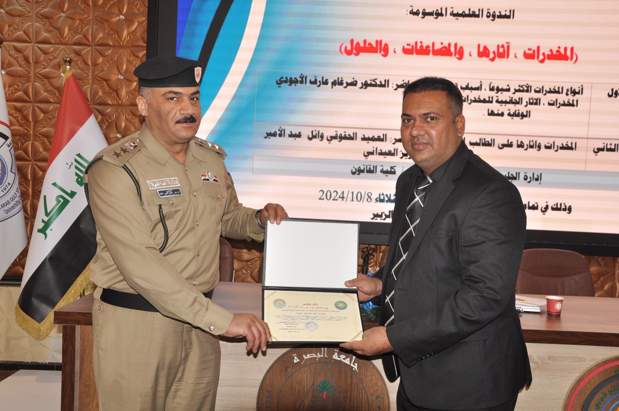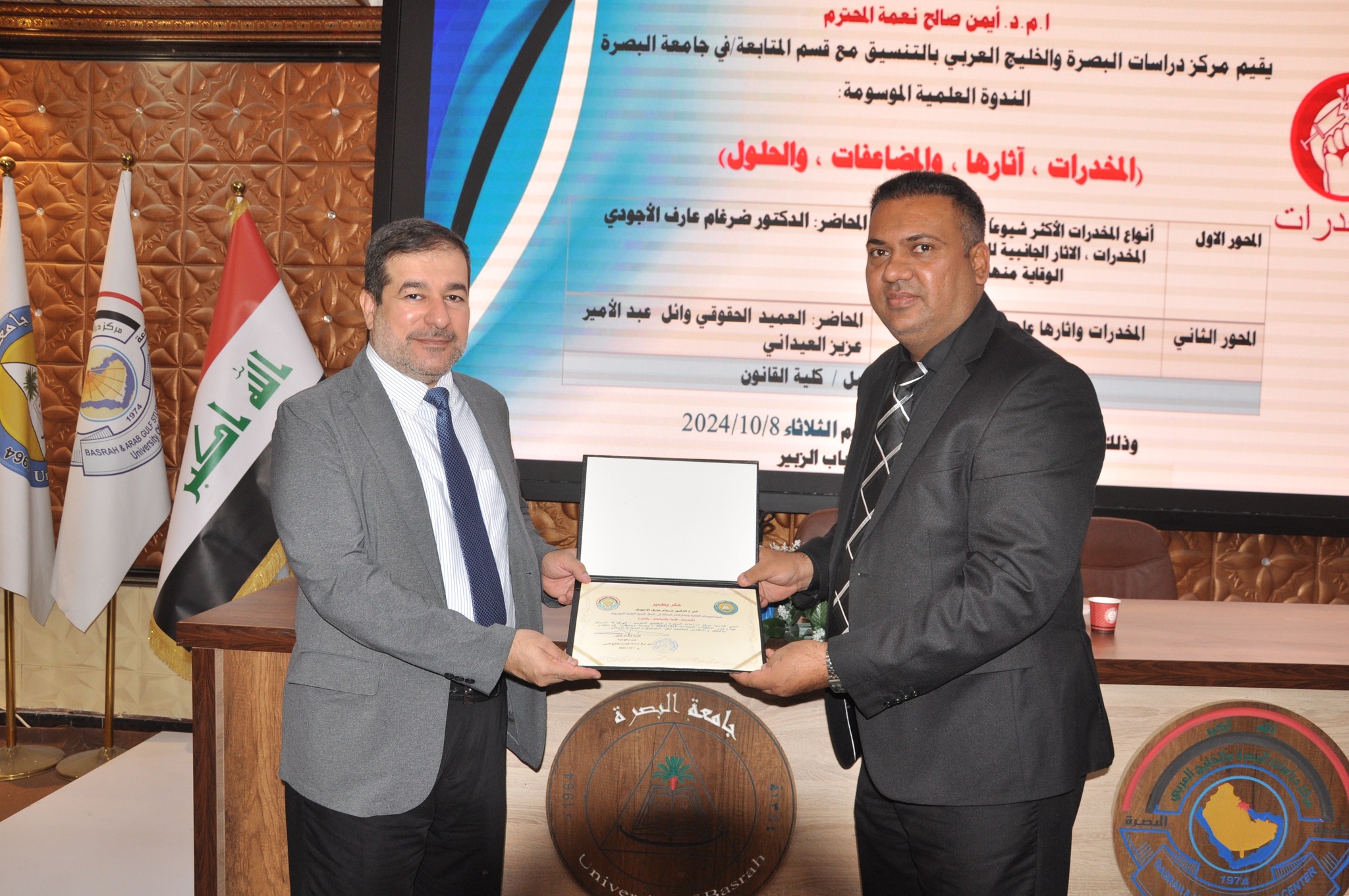 عقدت الجمعية العراقية للبحوث والدراسات الطبية بالتعاون مع مركز دراسات البصرة والخليج العربي في جامعة البصرة ندوة تحت عنوان (المخدرات ، أثارها ، والمضاعفات ، والحلول)، وتضمنت الندوة محاضرة لرئيس الجمعية الدكتور ضرغام الأجودي حملت عنوان (أنواع المخدرات الأكثر شيوعاً، أسباب تعاطي المخدرات، الآثار الجانبية للمخدرات وطرق الوقاية منها)، كما قدم العقيد تيسير عبد علي عبد من مديرية الدفاع المدني في محافظة البصرة محاضرة أخرى بعنوان (المخدرات وآثارها على الطالب الجامعي)، وتولى إدارة الجلسة التدريسي في كلية القانون الدكتور تيسير أحميد عبل، وقد حضر الندوة العديد من الباحثين والتدريسيين.